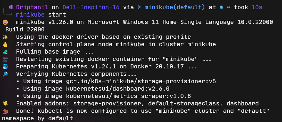 minikube start-> will create a single node clusterminikube stopminikube removeminikube statusminikube dashboard-> opens the dashboard in localhostminikube docker-env-> prints the environment variable for dockerminikube ssh-> open minikube in secure shell