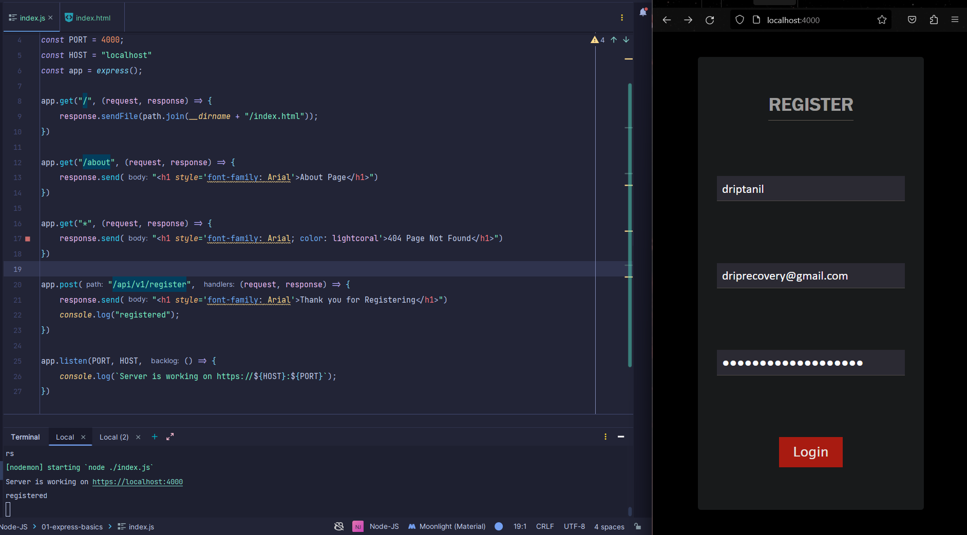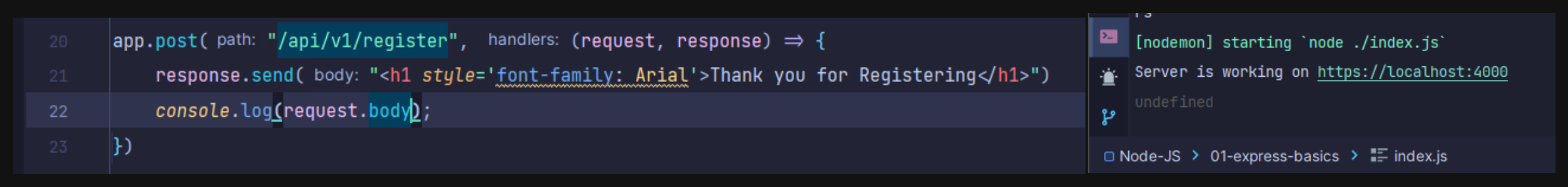 app.use(express.json())toapi.js,const express = require("express"); const bodyParser = require("body-parser"); const { response } = require("express"); const PORT = 4000; const HOST = "localhost"; const app = express(); app.use(bodyParser.urlencoded({ extended: false })); app.use(express.json()); app.get("/api/v1/userdata", (request, response) => { response.json({ name: "driptanil", email: "driprecovery@gmail.com", password: "thisisnotmypassword", }); }); app.get("*", (request, response) => { response.send( "<h1 style='font-family: Arial; color: lightcoral'>404 Page Not Found</h1>" ); }); app.post("/api/v1/register", (request, response) => { const userName = request.body.name; const userEmail = request.body.email; const userPassword = request.body.password; response.json({ success: true, name: userName, email: userEmail, password: userPassword, }); }); app.listen(PORT, HOST, () => { console.log(`Server is working on https://${HOST}:${PORT}`); });