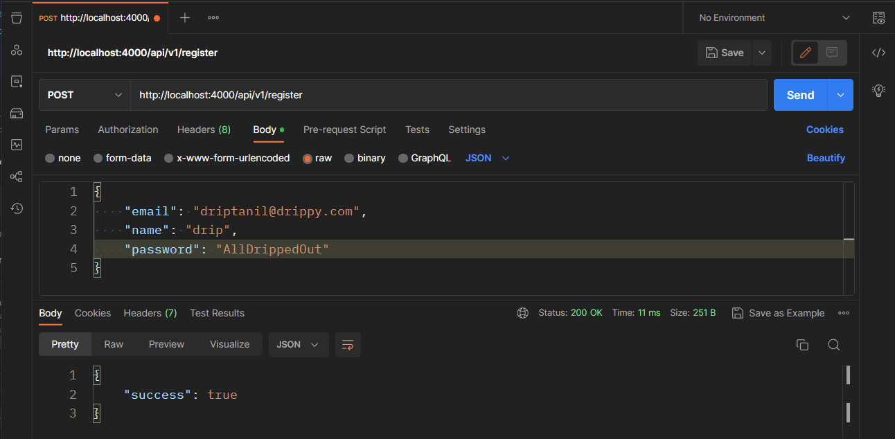 app.use(bodyParser.urlencoded({ extended: false }));- Using express.json() in app to avoid this bug, where only "success" shows up, and it misses "name", "email", "