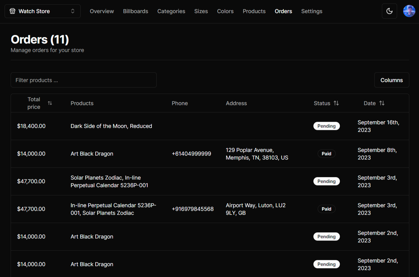 Create, Edit, Delete : Billboards, Categories, Sizes, Colors, Products, Orders Filtering using colors and sizes Add to cart and Payment using Stripe
